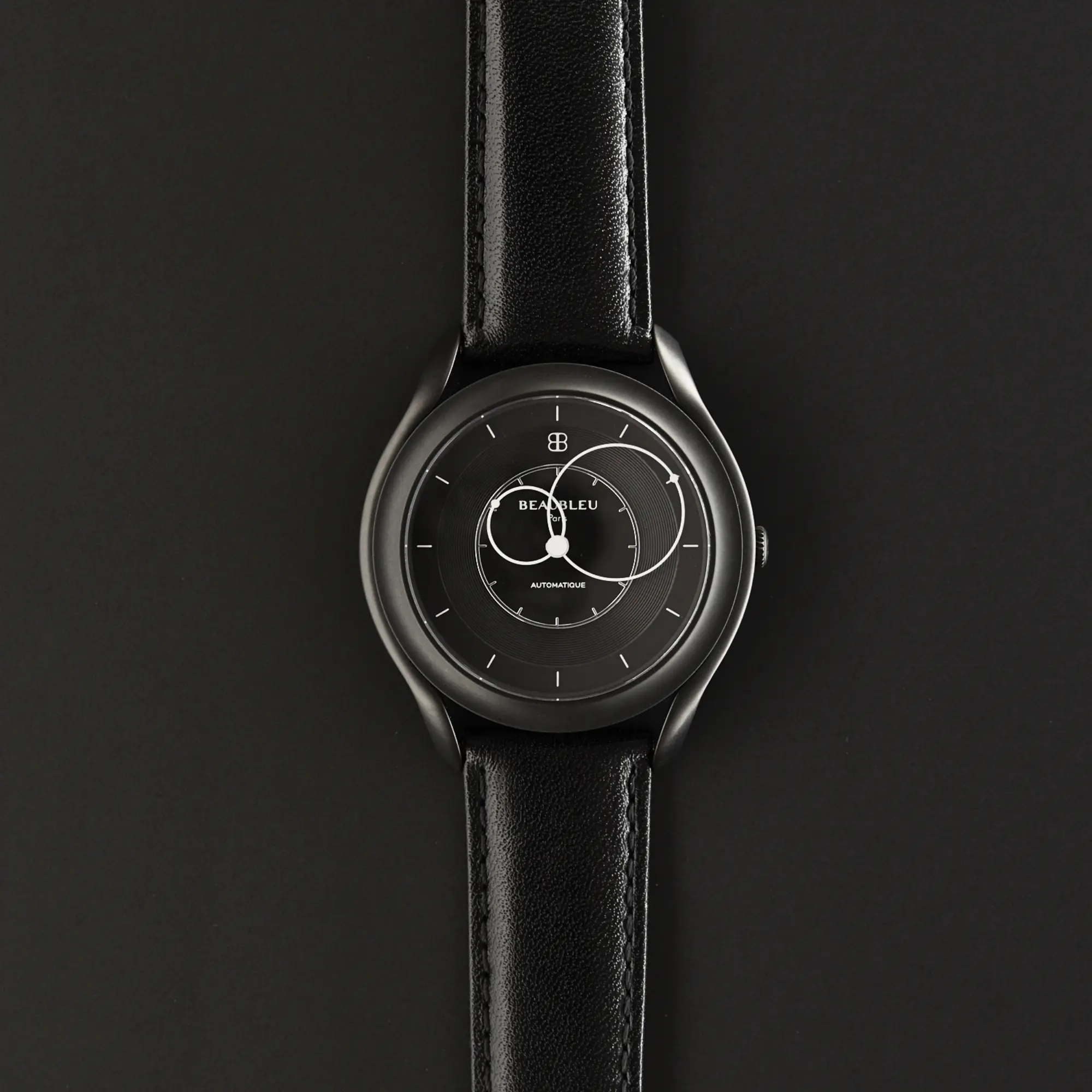 Le Mystérieux allie sobriété et sportivité avec un boîtier noir mat qui met en valeur nos emblématiques aiguilles rondes, en rotation au-dessus du cadran finement rainuré.